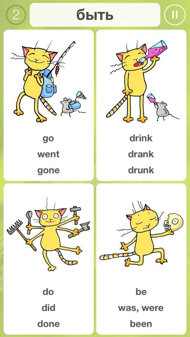 Он отправляется в путешествие по Лондону, а волей разработчиков попадает в самые неожиданные ситуации, которые помогут запомнить неправильные глаголы. Причем и сами слова, и три формы каждого. Что только ни придется делать коту ради пользователей! То его заставляют подметать, то вымокнуть до нитки или выдувать мыльные пузыри. Все это — карточки с неправильными глаголами, которые пользователям Irvy the Cat придется запоминать.