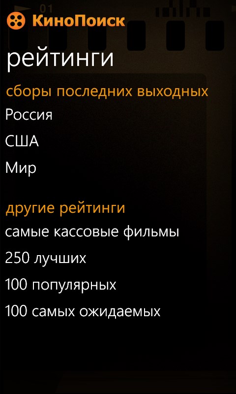 В разделе “Фильмы” помимо грядущих фильмов вы можете посмотреть списки, сгруппированных по следующим параметрам: «Кассовые сборы», «Самые кассовые фильмы», «Топ-100 ожидаемых фильмов», «Топ-250 лучших фильмов», «Топ-100 популярных фильмов», а также «Топ-100» популярных имен.