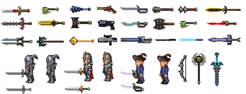 Мечи — это холодное оружие, которое можно разделить на 2 основные категории: короткие мечи и палаши. У коротких мечей очень ограниченный диапазон, и они атакуют горизонтальным колющим движением, а не дугой. На настольном компьютере, консоли и мобильном устройстве они действуют более похоже на копья, поскольку могут наносить удары в большем количестве направлений.Палаши летают над головой, что облегчает победу над летающими и прыгающими врагами.