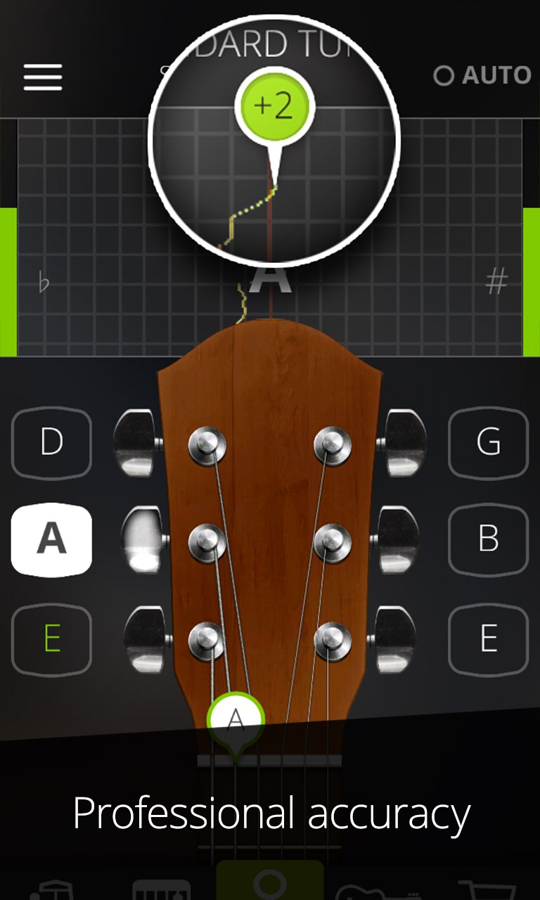 На сегодняшний день Гитарный Тюнер (GuitarTuna) лучшее приложение для настройки гитара. Интерфейс не перегружен, а скорость функционирования находится на высоте. В отличие от аналогичных настройщиков гитары, Guitar Tuna может работать как с обычной акустической гитарой, так и с электрической, она исправно определяет звук в условиях шума, автоматически убирая его. Также в программе реализовано использование и для левшей, еще плюсом является возможность работы с нестандартным числом струн. При помощи данного универсального тюнера можно настроить гитару, бас-гитару, укулеле и множество других струнных инструментов. Guitar Tuna пользуются свыше 20 миллионов человек: от начинающих музыкантов до профессионального своего дела. Еще одно достоинство GuitarTuna для Андроид то, что он имеет раздел с обучающими пособиями для игры на гитаре.