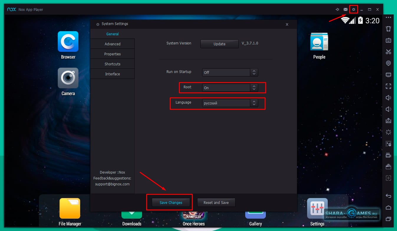 Включите режим Root на Nox, щелкнув значок шестеренки и поставив отметку в поле
