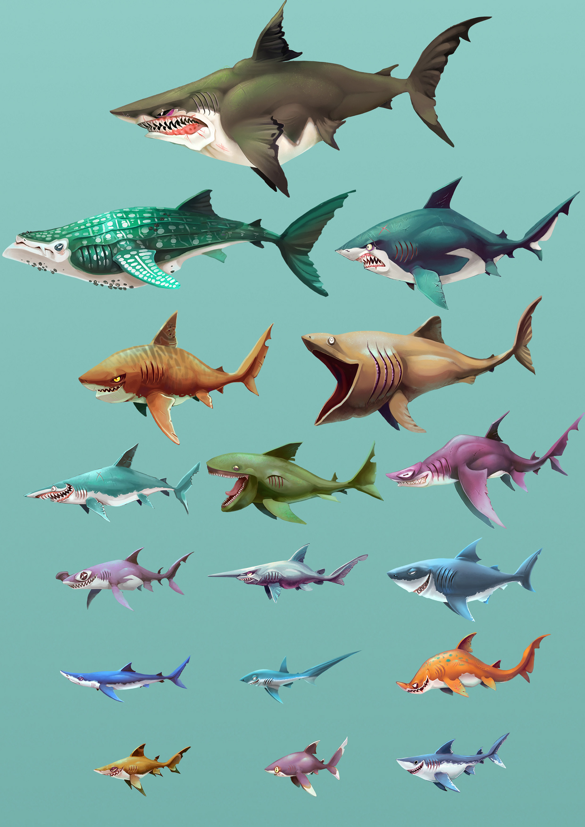 17 видов акул в 7 ярусах разного размера для сбора. Играйте за акул, от проворной акулы-молота до легендарной большой белой акулы!