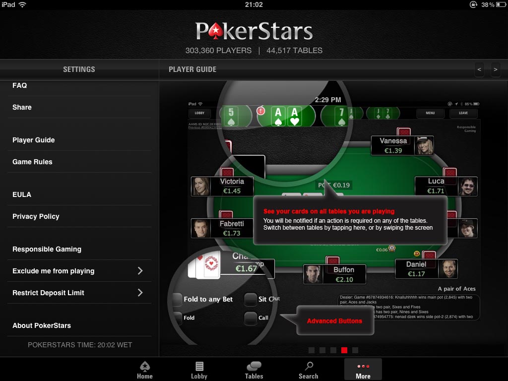 Гаджеты компании Apple крайне популярны у любителей покера поэтому неудивительно появление удобных приложений для игры в покер на iOS. Первой комнатой попавшей в App Store стала PokerStars, быстро ставшая популярной. Покерный клиент комнаты предлагает полноценный функционал, за исключением отсутствия возможности внести дeньги или сделать кeшаут. Для этого тебе понадобится полный клиент комнаты, который можно установить на компьютер. В остальном приложение комнаты предлагает все функции включая столы Zoom Poker. Играть с iPad очень удобно! Узнай подробнее о ПокерСтарс на мобильных устройствах.