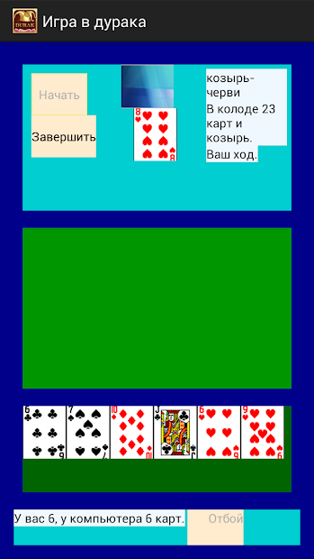 Кроме игры с друзьями через Bluetooth полная версия имеет игру против ОС Android. Стоит отметить, что победить систему не так легко, однако возможно, обладая определенным опытом и игровыми навыками. Скачать бесплатно игровое приложение «Дурак» для Android – это возможность наслаждаться отличным времяпровождением в одиночестве или с друзьями. Карточная игра дурак для Андроида увлечет вас буквально с первой партии, а также поможет развить такие полезные качества, как внимательность, сосредоточенность и умение анализировать.