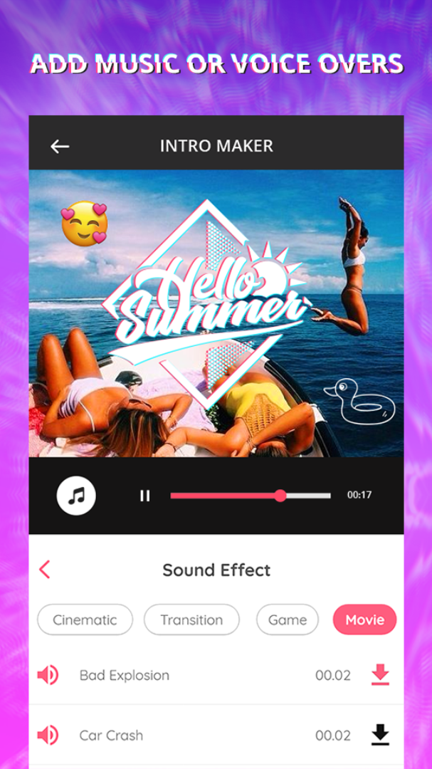 Простой мобильный редактор видео с базовыми функциями видеомонтажа, ориентированный на создание коротких роликов для интернета. Действия пользователя сведены к минимуму, так как в редактор встроен помощник, который автоматически генерирует фильм. Достаточно импортировать видеоролик, подобрать или загрузить фоновое аудио, при необходимости обрезать длительность и запустить процесс сборки. Итоговый ролик можно уникализировать, комбинируя различные фильтры, а затем сохранить на телефон или отправить напрямую в Instagram.