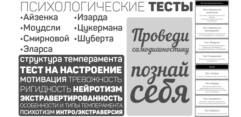 Исаака * Характерологический тест К. Леонхарда * Тест на характерологическую акцентуацию личности и нервно-психическую неустойчивость* Тест: Количественное соотношение* Тест на коммуникативные и организаторские способности* Тест на тип профессии* Тест межличностных отношений Т. Лири* Тест описания поведения К.Томас* Диагностика состояния агрессии (тест Басса-Дарки)* Тест на агрессивность в отношениях (А. Ассинджер)* Тест на уровень эмпатических тенденций* Тест на уровень коммуникабельности В.Ф. Ряховского* Тест оценки самоконтроля в общении М. Снайдера* Тест оценки коммуникативных способностей* Тест удовлетворенности браком* Тест взаимодействия супругов в конфликтных ситуациях (мужской вариант)* IQ-тесты Айзенка* Тест взаимодействия супругов в конфликтных ситуациях (женский вариант)* Висбаденский опросник позитивной психотерапии и семейной психотерапии (WIPPF)* Тест на шизофрению* РОП — ролевые ожидания и притязания в браке* Карта интересов Голомштока* Техника Джовайши* Маркер-проективный тест* Тест — Посадить два дерева в сад* Тест на аутизм* Опросник шизотипических черт личности (SPQ-A)* Опросник SAN (здоровье, активность, настроение)* Тест Равена* Определение направленности личности* Методика Q-сортировки* Тест Люшера* Методика диагностики темперамента Стрелау* MMPI — полная версия* Тест на ведущий канал восприятия Ефремцева* Голландская методика профессионального самоопределения