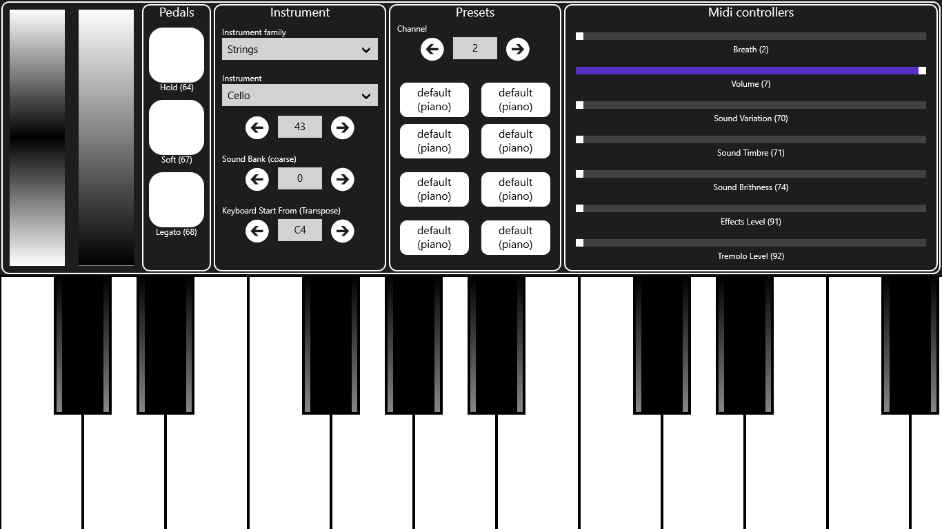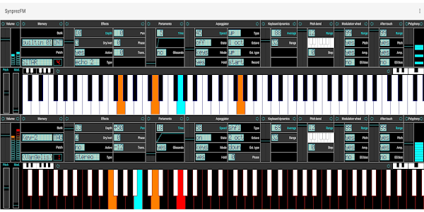 Во время проигрывания звука, вы можете использовать эффект вибрато управляя активными клавишами с помощью пальцев или переключая клавиатуру в различные октавы. Другие функциональные параметры доступны над клавиатурой, в том числе 2 вида портаменто, уровни чувствительности для определёния тона инструмента или модуляция громкости, и некоторые эффекты, которые дают ощущение глубины при использовании гарнитуры, особенно для щипковых звуков. Вы также можете настроить полифонию, чтобы адаптироваться к возможностям вашего устройства. Благодаря оптимизированному ключевому функционалу, вы можете услышать до 16 каналов играющих вместе, даже на устройствах среднего класса.