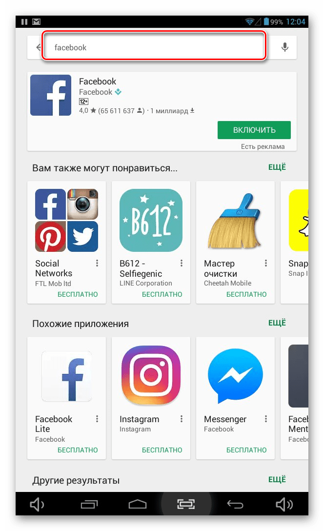 β Π΅ΡΠ»ΠΈ ΠΏΡΠΈΠ»ΠΎΠΆΠ΅Π½ΠΈΡ Π½Π΅Ρ Π½Π° Π΄ΠΈΡΠΏΠ»Π΅Π΅ Π²Π°ΡΠ΅Π³ΠΎ Π΄ΠΎΠΌΠ°, ΠΏΠΎΠΏΡΠΎΠ±ΡΠΉΡΠ΅ Π½Π°ΠΉΡΠΈ Π΅Π³ΠΎ Π² ΠΏΠ°Π½Π΅Π»ΠΈ ΠΏΡΠΈΠ»ΠΎΠΆΠ΅Π½ΠΈΠΉ. 2. ΠΠ°ΠΉΠ΄ΠΈΡΠ΅ Β« Facebook Β» Π² ΡΡΡΠΎΠΊΠ΅ ΠΏΠΎΠΈΡΠΊΠ°. ΠΠΎΡΠ½ΠΈΡΠ΅ΡΡ ΡΡΡΡΠΎΠΉΡΡΠ²Π° ΠΏΠΎΠΈΡΠΊΠ° (ΡΠΈΠΌΠ²ΠΎΠ» ΡΠ²Π΅Π»ΠΈΡΠΈΡΠ΅Π»ΡΠ½ΠΎΠ³ΠΎ ΡΡΠ΅ΠΊΠ»Π°) Π² ΠΏΡΠ°Π²ΠΎΠΌ Π²Π΅ΡΡ Π½Π΅ΠΌ ΡΠ³Π»Ρ Google Play, Π° ΡΠ°ΠΊΠΆΠ΅ Π²Π²Π΅Π΄ΠΈΡΠ΅ Β« Facebook Β». ΠΠ°ΠΆΠΌΠΈΡΠ΅ Β« OK Β» Π½Π° ΠΊΠ»Π°Π²ΠΈΠ°ΡΡΡΠ΅, ΡΡΠΎΠ±Ρ Π½Π°ΡΠ°ΡΡ ΠΏΠΎΠΈΡΠΊ.