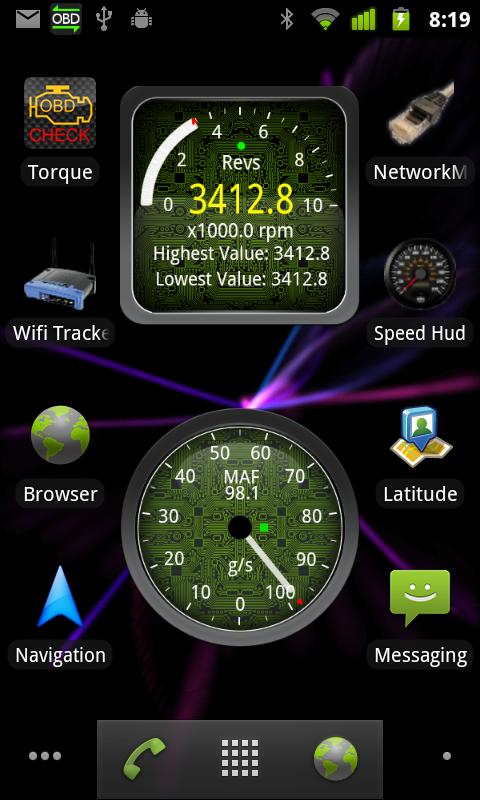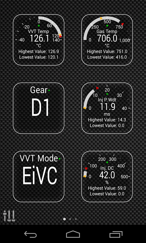 — Отображение показателей датчиков автомобиля в режиме реального времени и сохранение их в файл. В зависимости от конфигурации автомобиля вы можете следить за следующими параметрами: скорость движения, обороты двигателя, температура двигателя, момент зажигания, объем воздуха на входе и т.д.
