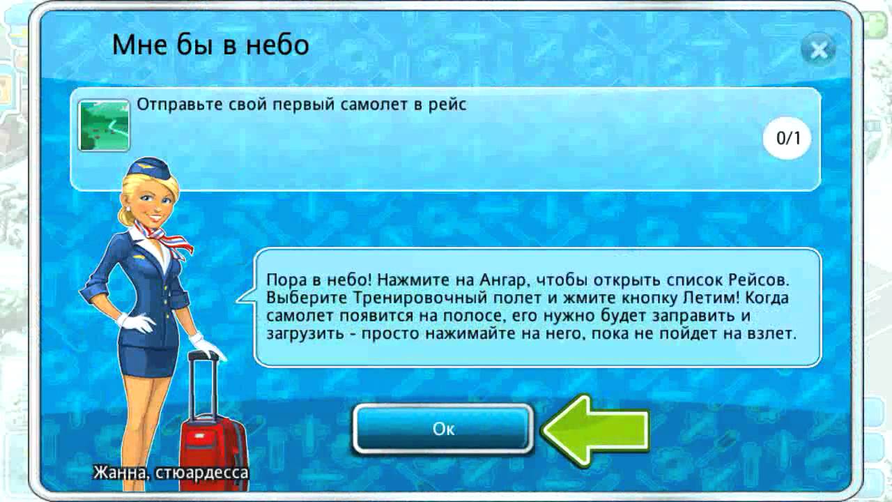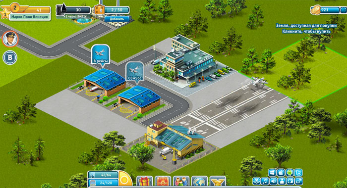 Купить самолет в этот ангар (клик по ангару откроет магазин самолетов) Построить взлетную полосу Собрать готовых к путешествию пассажиров с жилых зданий Открыть список доступных рейсов (кликнуть по ангару с самолетом или по иконке рейсов в правом нижнем углу) и выбрать подходящий Кликнуть «Летим» в окне рейсов! В игре есть несколько типов зданий: Жилые дома – они дают пассажиров Коммерция (магазины, рестораны и тд) – дает деньги Мэрия – определяет максимальное количество жителей Терминал – определяет максимальное количество пассажиров Взлетные полосы – нужны для взлета и посадки самолетов Ангары – в них хранятся самолеты