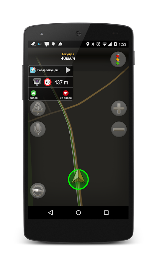 За счет крупного окна приложения на весь размер дисплея можно получать массу полезной информации. Не только банальные текущую скорость, разрешенный предел и расстояние до камеры, но и, например, расположение камеры относительно центра дороги – это показывает положение подсвеченной голубеньким полоски на поперечной линии через весь экран.