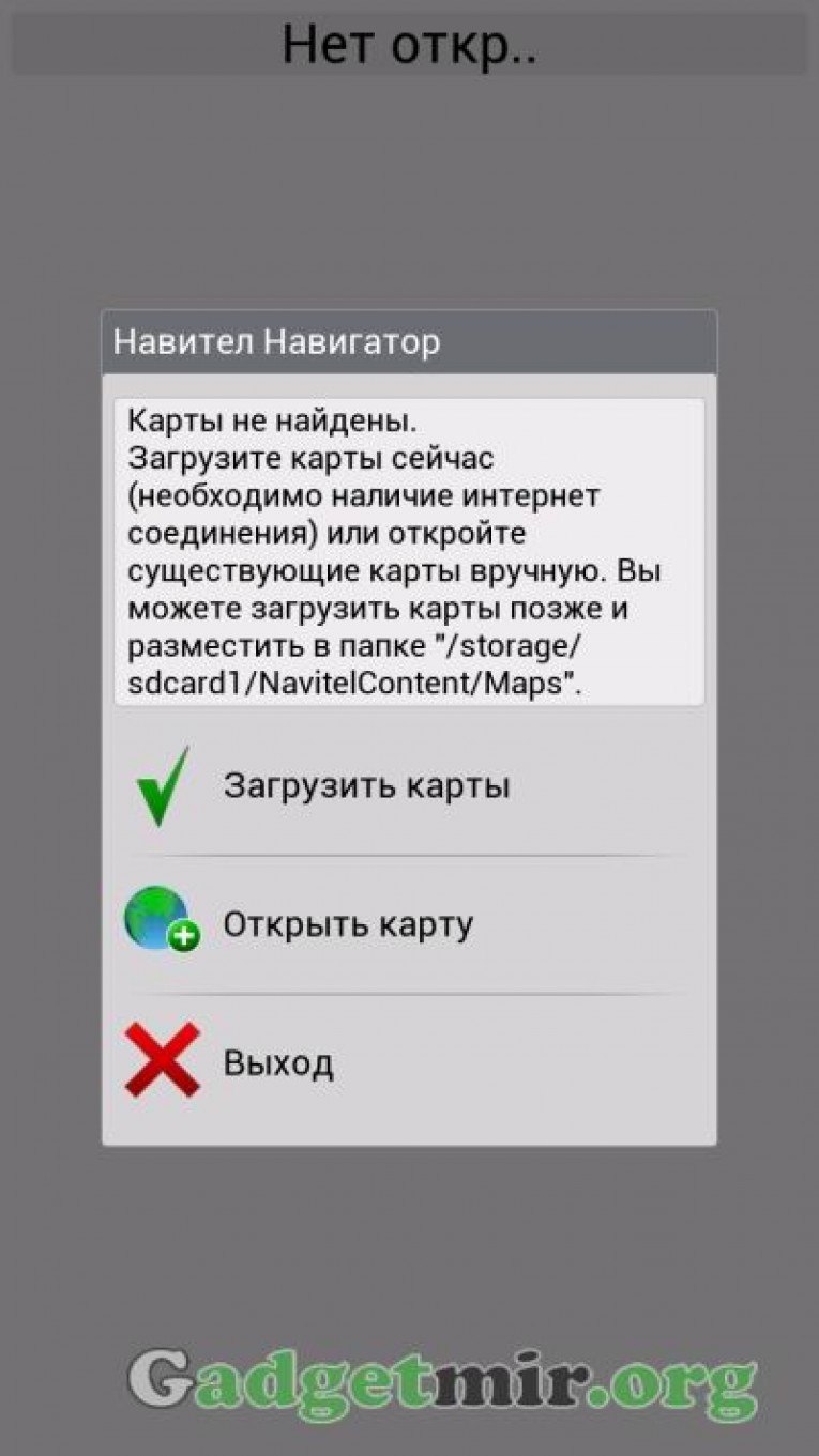 Способ 1. Ну что ж, Вы установили навигатор, и собираетесь добавить карту в GPS навигатор Navitel. Перед тем как добавить карту, нужно сначала запустить навигатор, он создаст на памяти устройства все необходимые ему папки. После запуска он сразу попросит указать путь к папке с лежащей в ней картой. Но для того, чтобы случайно не удалить карту я предлагаю поместить ее в папку навигатора, поэтому нажимаем кнопку «Выход».