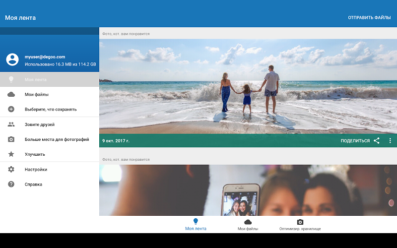 Сетевые возможностиDegoo ограничиваются такими действиями, как проверка объема используемого хранилища, приглашение друзей зарегистрироваться, изменение пароля и обновление учетных записей. Также есть возможность отправлять файлы другим пользователям, которые не связаны напрямую с файлами резервных копий. Он больше похож на сервис передачи файлов, похожий на WeTransfer.