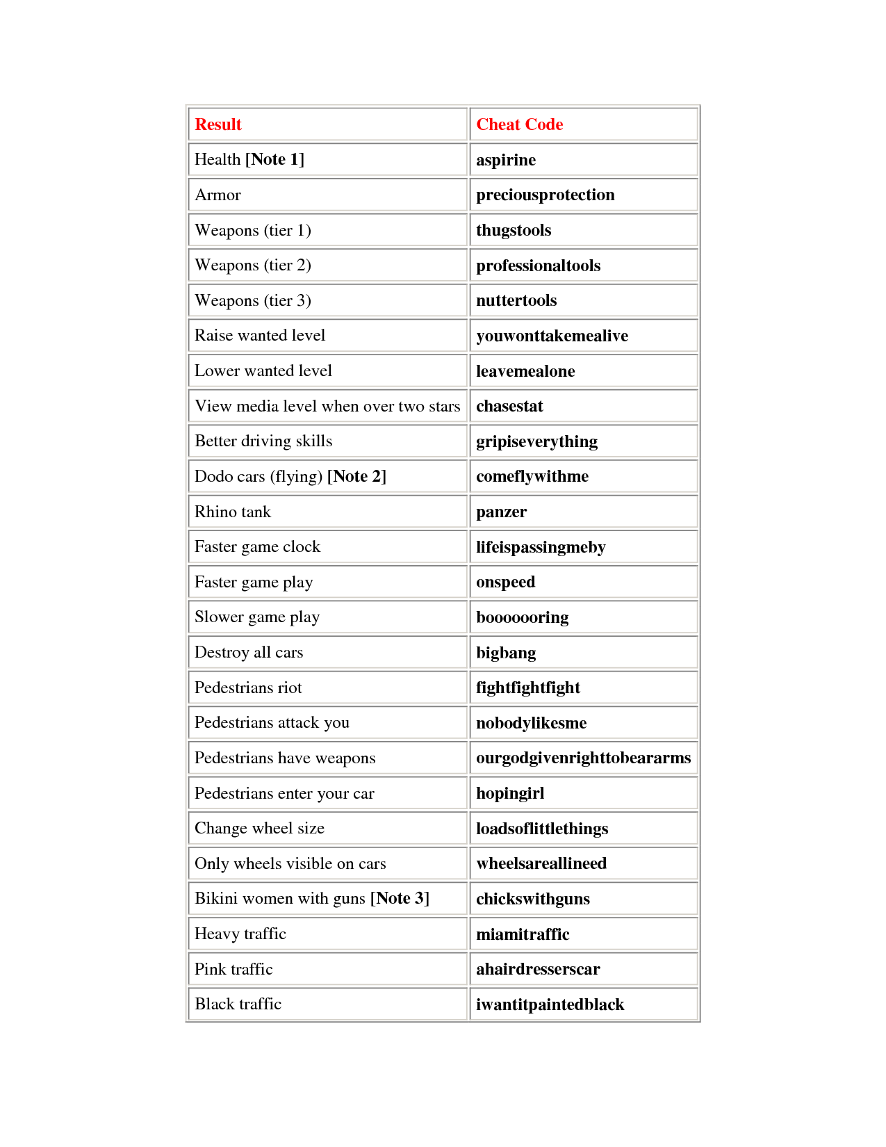 CERTAINDEATH — с сигаретой в зубах SEAWAYS — ездить с машиной по морю LOADSOFLITTLETHINGS — увеличить шины у спортивных машин AHAIRDRESSERSCAR — все машины — розовые IWANTITPAINTEDBLACK — все машины — черные GRIPISEVERYTHING — улучшенное управление машинами CHASESTAT — показать Media Level СHICKSWITHGUNS — из пешеходов оружие только у женщин AIRSHIP — возможность летать на лодках HOPINGIRL — банда Версетти превращается в девушек в вашу машину залазят пешеходы