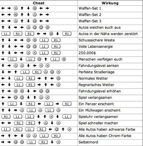 THUGSTOOLS — гангстерское оружие (1 уровень по мощности) PROFESSIONALTOOLS — профессиональное оружие (2 уровень по мощности) NUTTERTOOLS — оружие (3 уровень по мощности) PRECIOUSPROTECTION — полная броня ASPIRINE — полное здоровье YOUWONTTAKEMEALIVE — +2 к уровню Wanted Level LEAVEMEALONE — Wanted Level = 0 (вас никто не ищет) APLEASANTDAY — хорошая погода ALOVELYDAY — неплохая погода ABITDRIEG — тучи CATSANDDOGS — дождь CANTSEEATHING — туман PANZER — получить танк LIFEISPASSINGMEBY — ускорить время BIGBANG — взорвать близстоящие машины STILLLIKEDRESSINGUP — изменить skin (шкуру) игрока FIGHTFIGHTFIGHT — пешеходы начинают драться