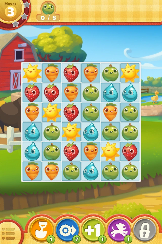 Farm Heroes Saga — это игра в жанре «три в ряд». Игрокам предоставляется сетка улыбающихся овощей и фруктов (подробнее об улыбках позже), и цель состоит в том, чтобы поменять местами соседние кусочки, чтобы составить совпадения из 3 или более.