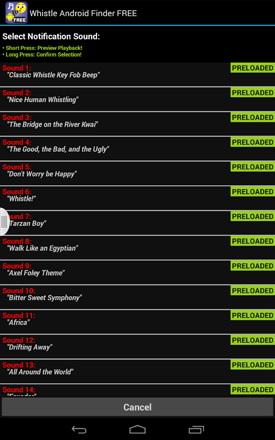 В случае, когда такой свист обнаружен, программа выдаёт заранее выбранный пользователем звук (мелодию) из представленных вариантов, а также показывает на экране разноцветную иллюминацию. Это особенно актуально, когда телефон потерян в темноте (в тёмной комнате), и подобное свечение поможет быстро его найти.
