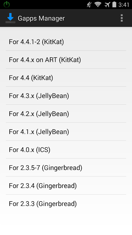 После запуска EasyGAppsОтдай кран значок меню отображаться в верхнем левом углу приложения к списку версии Google Apps доступны. Затем выберите один из пакетов, чтобы открыть официальный источник где он может быть загружен.