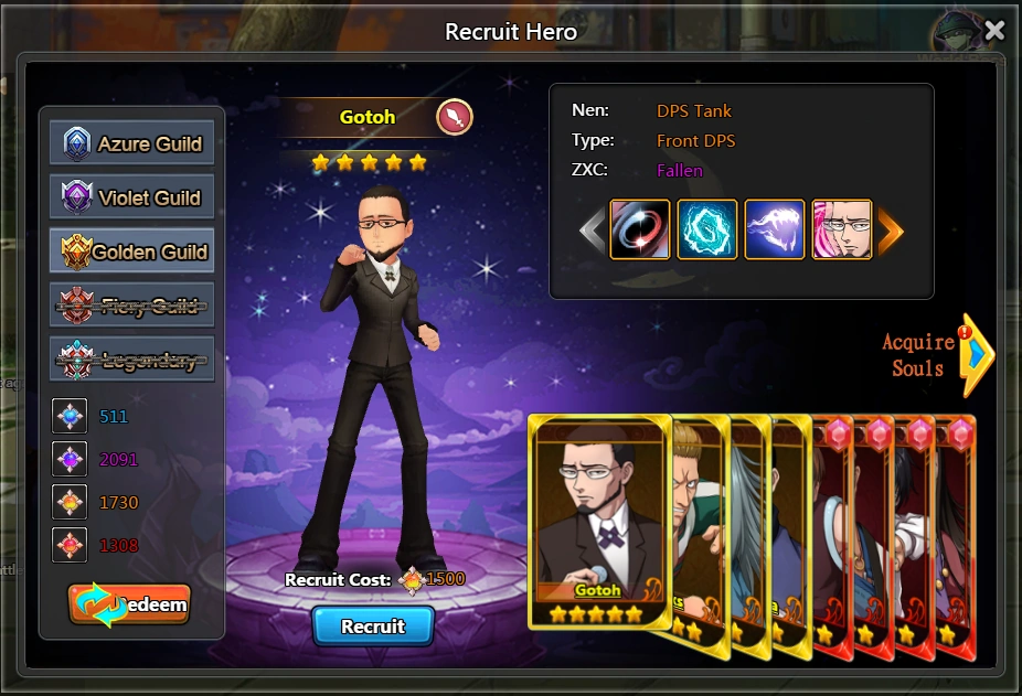 Герои нанимаются за души. Они делятся по качествам от простых до лучших: синие, фиолетовые, золотые и красные. Души зарабатываются в рулетке: есть бесплатные попытки и за игровое золото.