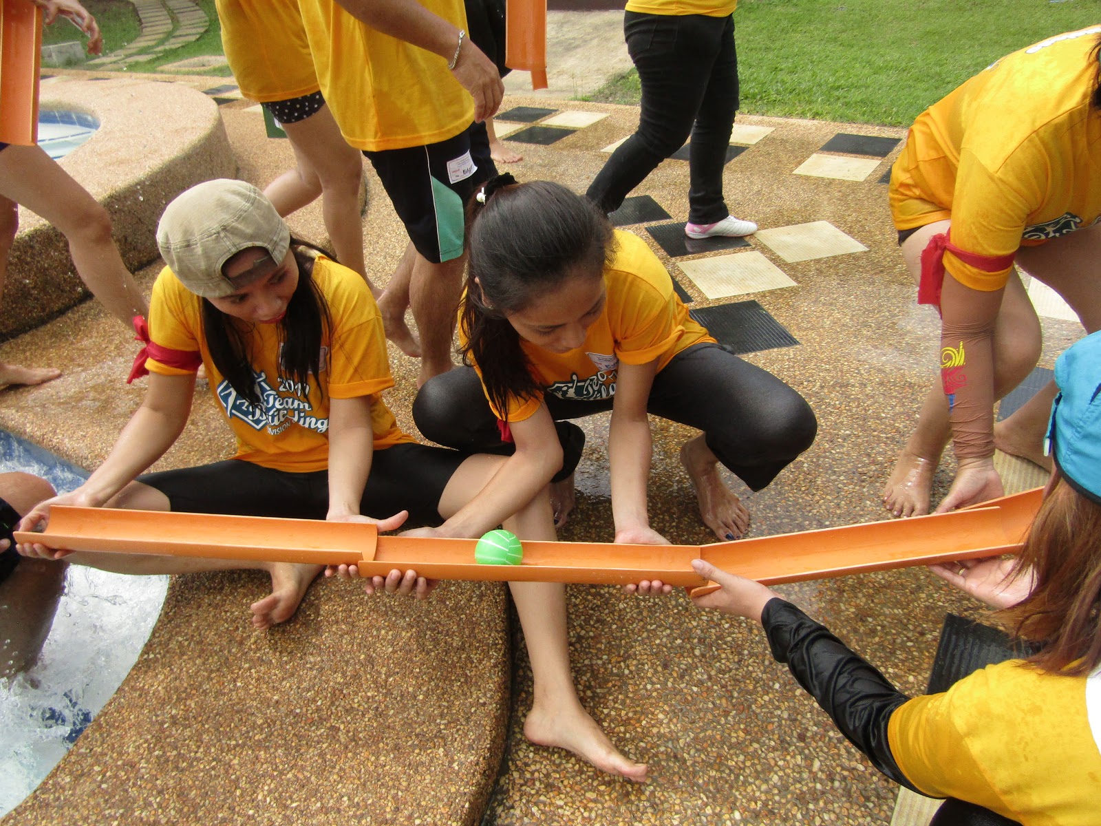 Члены команды работают вместе, пытаясь безопасно перемещать «токсичные отходы» с помощью ограниченного набора простых инструментов.