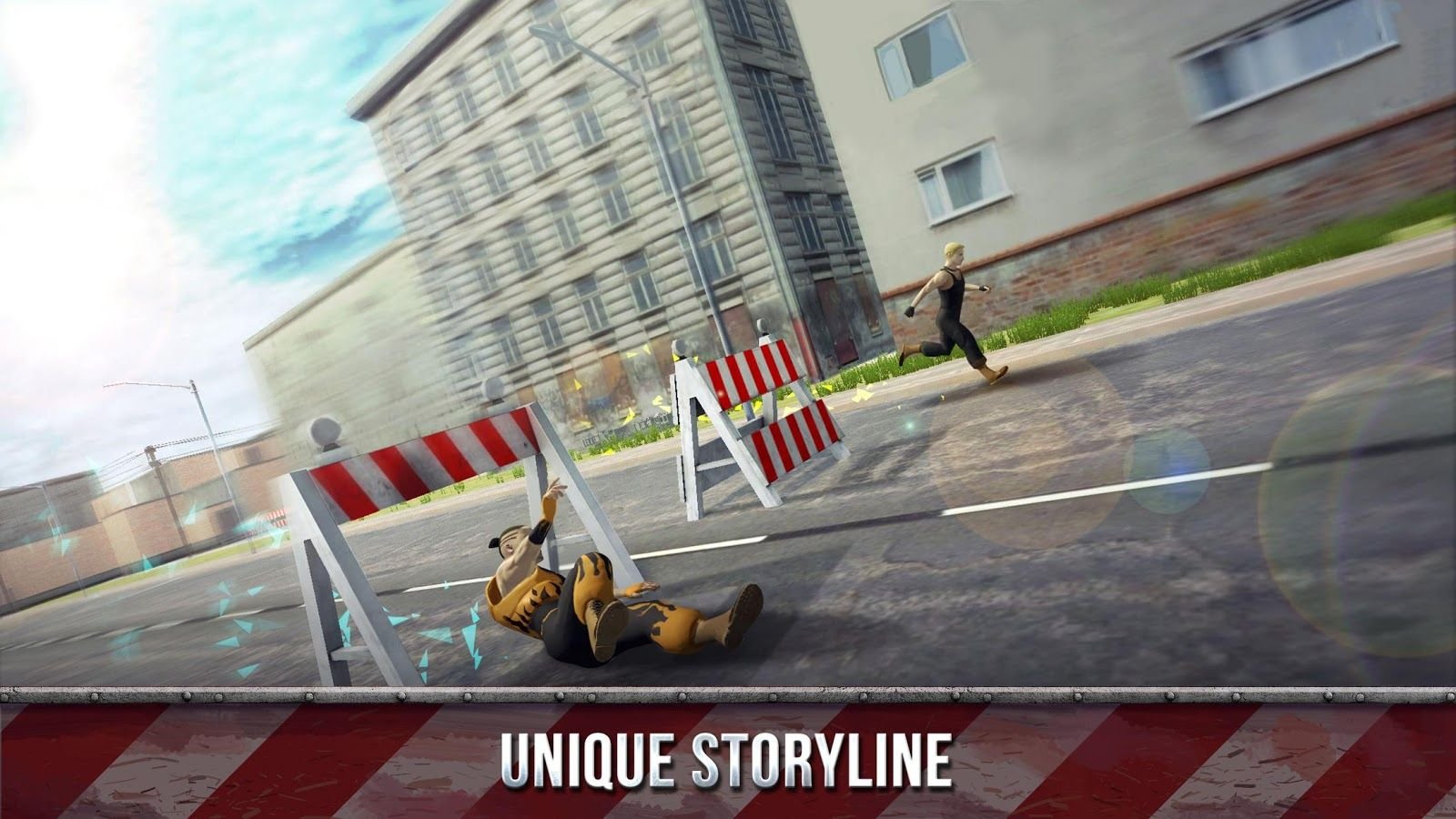 В Parkour Simulator 3D мы сделали простую завязку, чем-то напоминающую пролог NFS: Most Wanted, только вместо крутых автомобилей персонажи для передвижения используют нижние конечности. Первая анимированная сцена даёт понять, что вам предстоит управлять крутым и популярным в своем круге трейсером, которому бросил вызов герой-антагонист, тип неприятной наружности. После непродолжительного забега, выбившись в очевидные лидеры, персонаж попадает в западню и проигрывает состязание, потеряв при этом свой высокий статус и уважение коллег по акробатическому цеху.