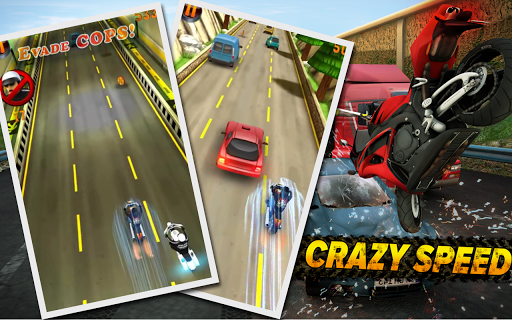 Особенности: — Выберите свою модель из парка самых быстрых и мощных мотоциклов! — Оцените потрясающие 3D-видеоэффекты! — Проверьте себя в сложных испытаниях! — Повышайте скорость, улучшайте тормоза и зарабатывайте дополнительные жизни! — Выберите любимую категорию мотоциклов: чопперы, кроссовые мотоциклы или супербайки! — Устройте рискованную езду на дорогах четырех уникальных регионов: Suburbs, Desert, Snow и Night City — Исследуйте 4 уникальных региона в 4 разных режимах! — Катайтесь по шоссе, федеральным трассам и автобанам! — Займите первое место в сетевых таблицах лидеров! — Откройте 23 достижения! — Изучите массу возможностей тюнинга!