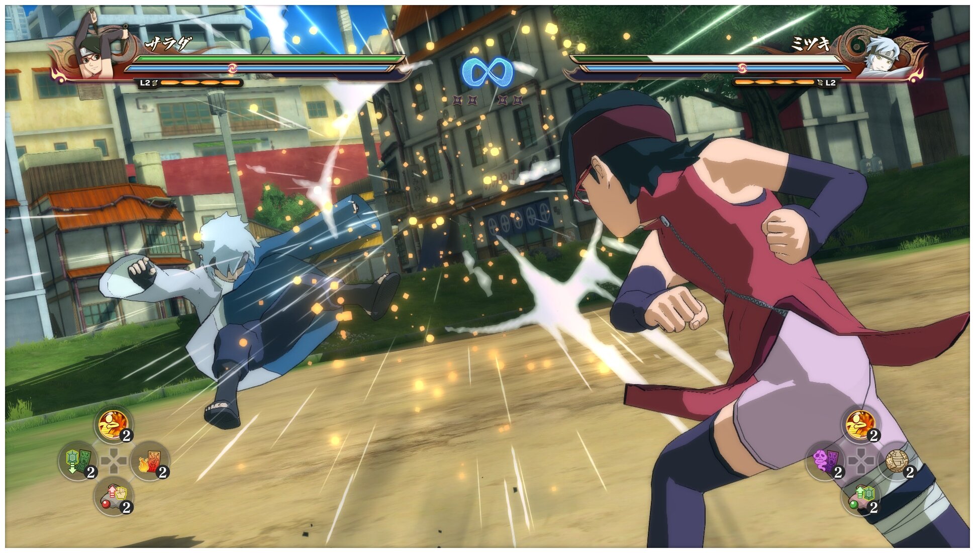 Боевая система имеет такой же базовый бой, как и любая другая игра серии, хотя некоторые мелкие аспекты представляют собой упрощенные и/или смягченные версии того, чем в конечном итоге станут боевые системы.Выполнение основных комбо и бросков при тщательном управлении счетчиком чакры (энергии) для выполнения специальных приемов — это основной элемент боя во всей серии.