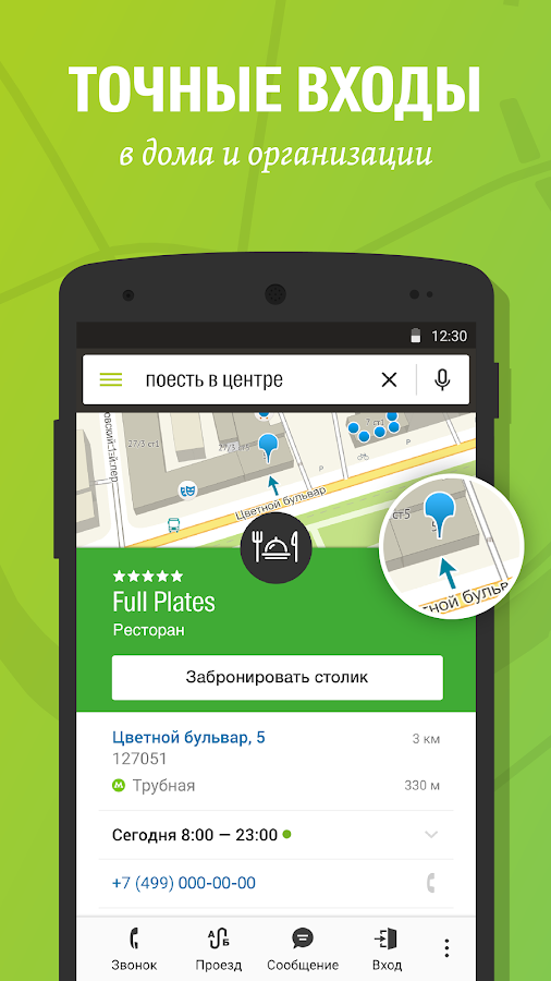 ВХОДЫ В ЗДАНИЕ Чтобы не искать нужный вам вход в бизнес-центр, загляните в 2ГИС. Приложение умеет входить в 2,5 миллиона компаний. Если вы ищете маршруты проезда общественного транспорта или автомобиля, 2ГИС укажет вам путь до самой двери.