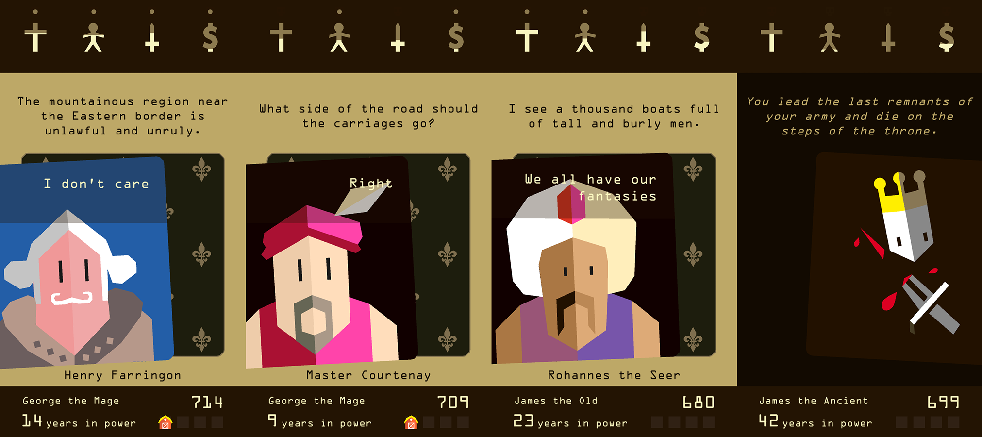 Каждый из них представлен картой в колоде. Вы проводите карточкой влево и вправо, чтобы принимать решения по просьбам и советам тех, кто обращается к вам за советом. Если все пойдет хорошо, ваше правление продлится до вашей естественной смерти. Если вы нарушите равновесие столбов, что ж, ваше правление будет продолжаться до вашей естественной смерти.