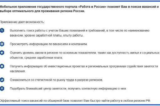 class=»img-responsive»>Мобильная программа, созданная на базе государственного портала от Федеральной службы по труду и занятости РФ. Дает возможность трудоустроится и найти жилье по соседству. Здесь соискатель может создавать, обновлять, редактировать и отправлять резюме нанимателю, ожидая приглашения на собеседование.