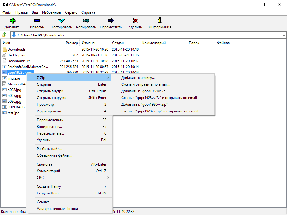 Пункты контекстного меню 7-zip