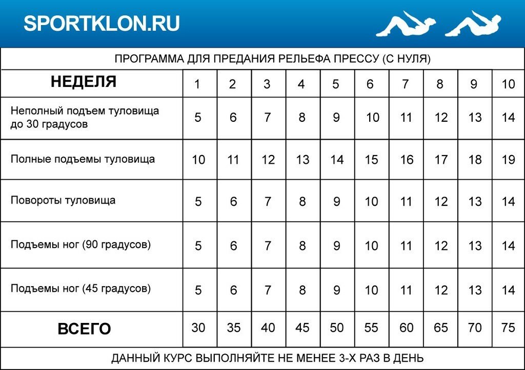 Ниже приведена недельная программа тренировок для пресса для девушек, которая подойдет всем дамам, активно занимающимся спортом: