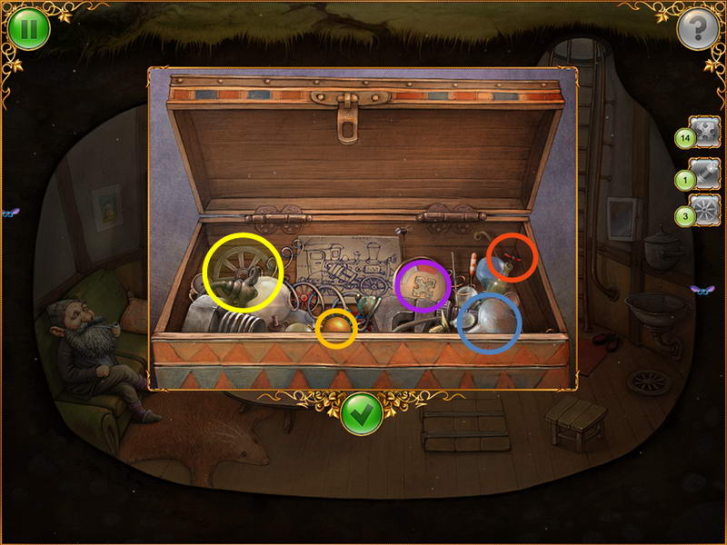 Видим, как поднялся мостик. Кликаем на мигающую будку вверху справа и получаем задание найти 4 рукоятки. Первую находим тут же, у левого берега. Идем в правую локацию, берем 1 рукоятку у железнодорожной стрелки. Спускаемся к гному и берем 1 рукоятку в цветке. Вылезаем, идем еще направо и берем 1 рукоятку слева от картинки. Применяем батарейку к будке справа, а колеса – к механизму. Картинка поднимается и открывает нам очередную головоломку, для которой нужно собрать 1 треугольник и 24 шарика. В этой локации берем 7 шариков (ищите их везде, они зеленого, оранжевого и синего цветов). Потом идем налево, во второй локации находим 6 шариков (открываем все заслонки, жмем все рычаги, шарики спрятаны в трех местах). Спускаемся к гному, ищем в сундуке, в погребе, в шкафчиках, на кресле и находим 6 шариков. Вылезаем, идем налево, находим 5 шариков. Оставим пока их и применим рукоятки к будке наверху. Здесь нас ожидает головоломка на зрительную память: радар в центре будет посылать сигналы разных цветов, а мы должны нажать на рукоятки соответствующих цветов в той же последовательности. Например: загораются желтый и зеленый – мы жмем на желтую и зеленую рукоятки. Головоломка нелинейная, единого прохождения нет. Сначала будут загораться два цвета, потом три, а потом четыре. Мини-игра будет пройдена, когда зеленым цветом загорятся все лампочки на панели.