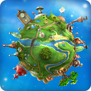 Паровозик привезет нас в только что собранную часть планеты. Кликаем на механизм на дереве – нужно собрать 3 колеса. Кликаем на будку справа – нужно найти батарейку. Собираем 7 паззлов в этой локации. Кликаем на картинку, на ней изображены самолетик и яблоко, нам нужно выставить самолетик: