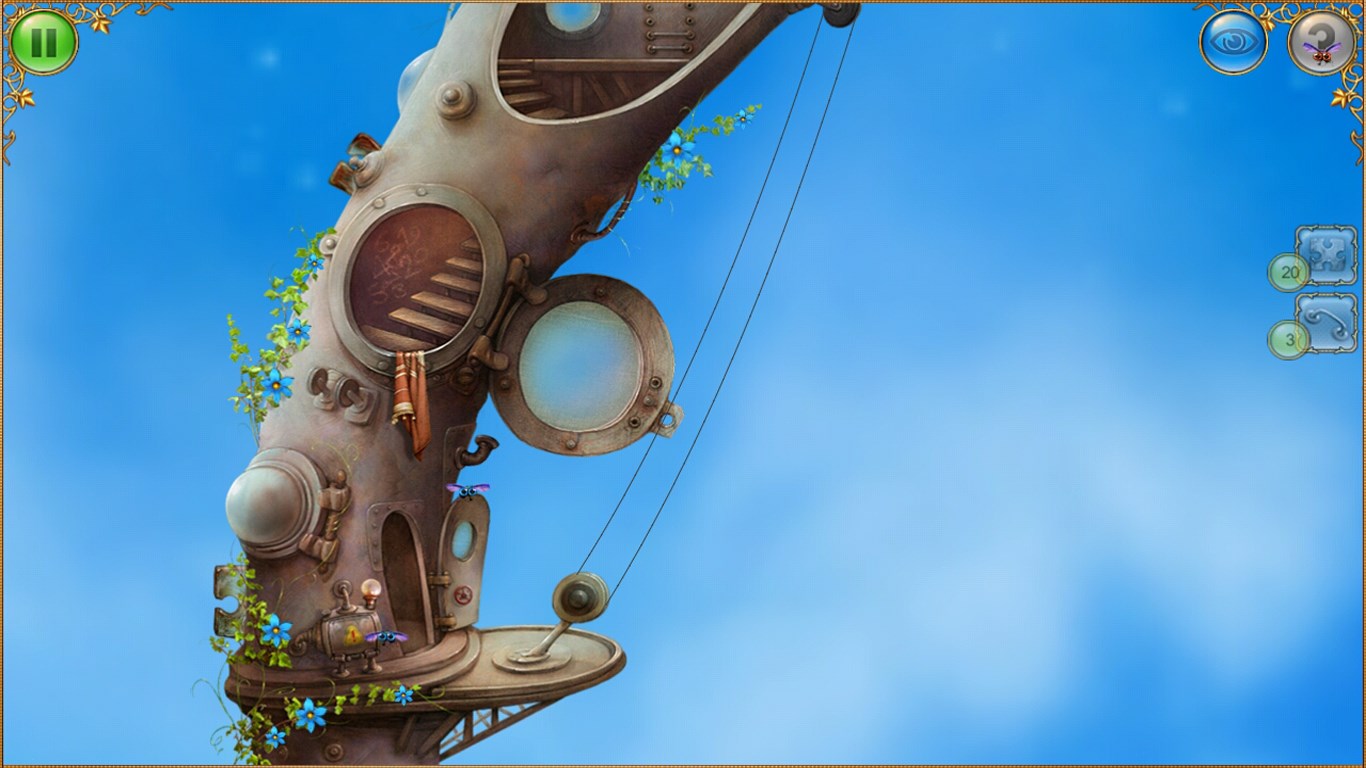 Итак, игра началась. Под значком «вопроса», в правой части экрана, находится квадратик с изображением «пазла» и маленьким числом «25». Это означает, что нам необходимо найти 25 частей пазла (пазлы=0/25 ). В начале игры компьютер нам показывает первые шаги. Следуем им. Берем пазл с левой стороны от башмака, щелкаем по красной кнопке лифта, расположенного в здании слева от башмака (пазлы=1/25 ). Заходим в лифт и оказываемся на втором ярусе. Осматриваем поломанную лестницу на третий ярус. Для того, чтобы попасть наверх, необходимо отыскать 5 железных палок, играющих роль ступеней (ступени=0/5 ). Щелкаем по первой железной палке, на которую указывает стрелка, после чего заходим в лифт и спускаемся на первый ярус (ступени=1/5 ).