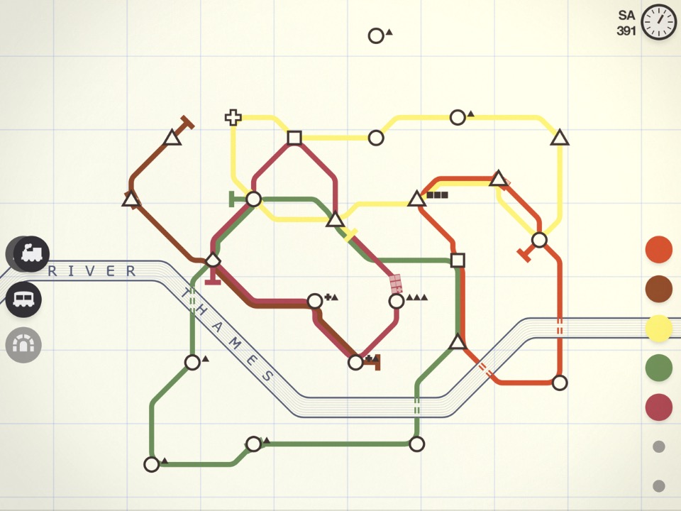 Увлекательный проект студии Dinosaur Polo Club предлагает вам спроектировать и построить сеть метрополитена растущего города. Игрок может строить ветки метро, связывающие станции, которые рисуются диагональю. Иногда игроку придется прокладывать маршрут через реки и туннели, но возможность оборудовать там проезд строго ограничена.