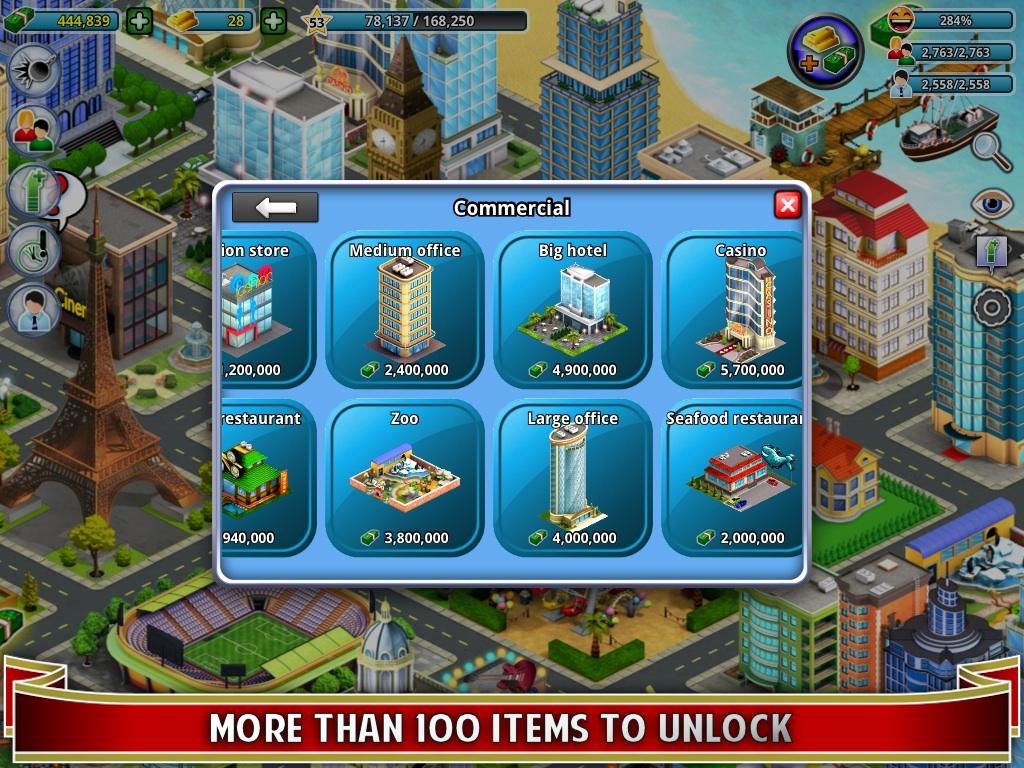 — Разблокировать и построить из списка из 150+ уникальных зданий (жилые, коммерческие, фермы, сообщества, украшения, парк, растения, пляжные и морские постройки, такие как нефтяные платформы и др.