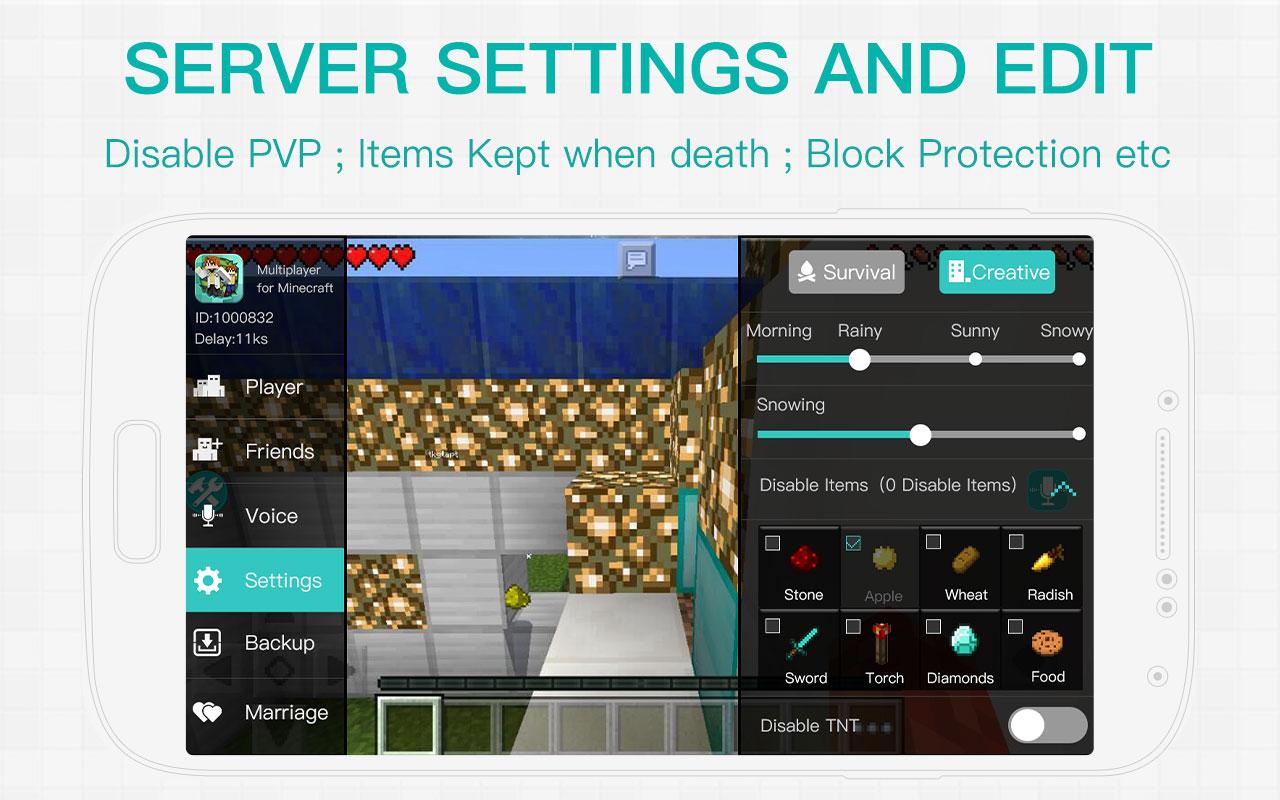 – Создавайте ЧАСТНЫЙ сервер, защищенный паролем – Приглашайте в игру друзей из Фейсбука и Твиттера – Ищите серверы по ID или режиму игры – Функция плавающего окна: баньте и кикайте гриферов | Защита от огня и взрывов | Защита предметов | Запрет на обновление блоков | Запрет на драки – До 10-ти игроков в одной онлайн-игре – Поддерживаемые Языки Английский | Русский | Корейский | Португальский | Тайский | Китайский (традиционный) | Испанский | Немецкий | Итальянский | Малайский | Tagalog | Немецкий | Японский | Турецкий | Французский | Индонезийский | Вьетнамский