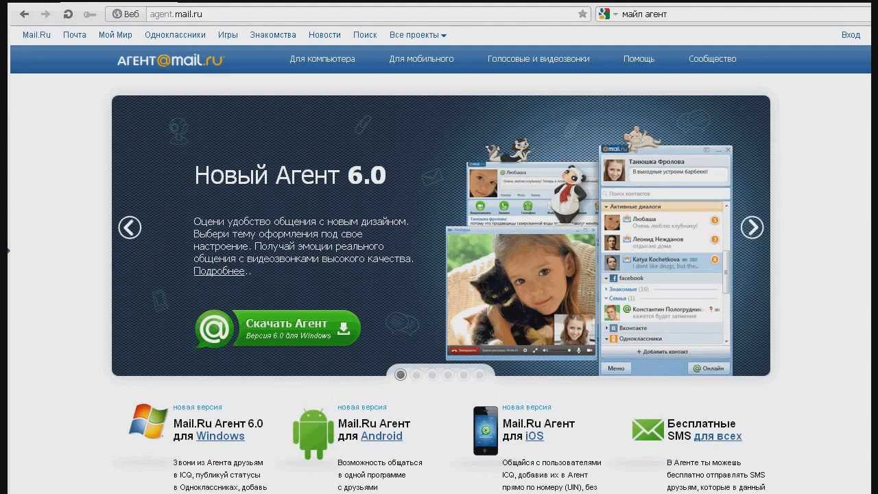Скачать агента mail.ru вы сможете абсолютно бесплатно с официального сайта по этой ссылке . Там же вы можете выбрать версию агента, либо самую последнюю для windows, либо для мобильного или же для Mac OS. Прочитаете возможности агента и другую интересную информацию.