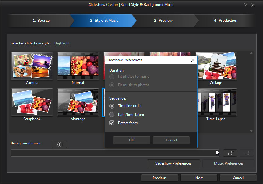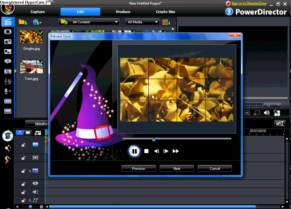 Можно использовать мастер Magic Movie для превращения мультимедийных файлов в фильм. Затем измените и улучшите созданный фильм в рабочей области.