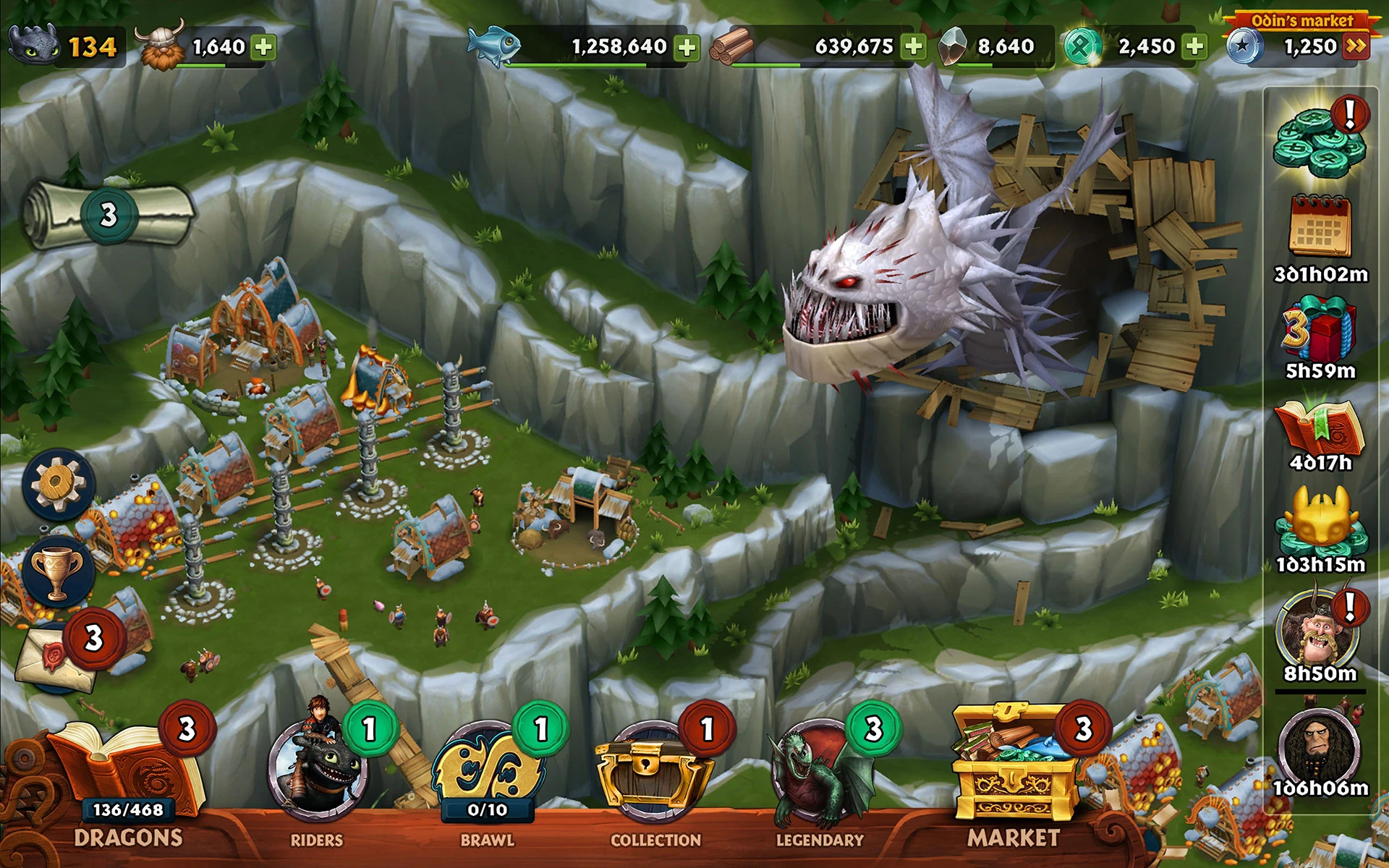 Какая игра без сражений? Тем более в игре с драконами. Они зря что ли огнем дышат? Сражения есть и имеют формат 3 на 3, участвовать против вас будут другие игроки или викинги, у которых есть свои драконы. Максимальный уровень, до которого может быть прокачан дракон — 80. Чем сильнее ваши питомцы, тем больше у вас шансов на победу.