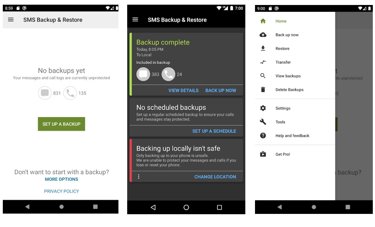 В приложении нажмите дополнительные параметры внизу, а в боковом меню нажмите «Восстановить».Следуйте инструкциям по резервному копированию локального файла, где бы вы ни сохранили его на своем телефоне с ПК, и он запросит множество разрешений, чтобы сделать себя приложением для обмена сообщениями по умолчанию для выполнения своей работы.