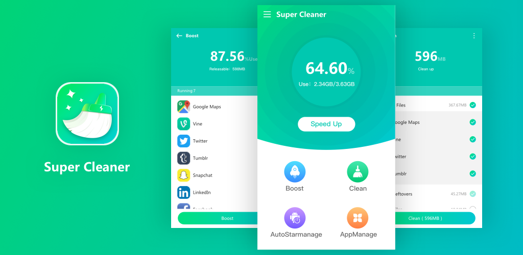βΊHow does Super Clean work?β¨ β Junk Cleaner — Clean junk filesβ¨ β one tap boost — boost phone by one tap β Speed Booster — Optimize memory and speed up your phoneβ¨ β Battery Saver — kills battery draining apps to save power β CPU Cooler — cool down your phone temperature β Antivirus — A powerful virus cleaner that efficiently removes all threatsβ¨ β App Manager — Analyze and manage the status of apps intelligently β Cache Cleaner — Clean up useless application cache filesβ¨ β Game Booster — Boost speed performance and expertly free up memory spaceβ¨