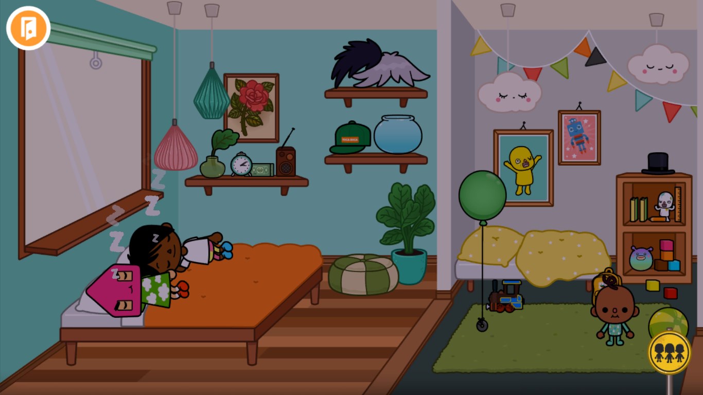 Чтобы перейти в другую область карты достаточно провести по экрану влево или вправо, для смены времени суток – нужно нажать на солнце или луну, а для выполнения очередного задания – коснуться его иконки. Для перемещения персонажа в комнату или какое-либо другое место достаточно подойти к знаку «Тротуар», размещенному в нижнем правом углу экрана и переместить на него персонажей. Дополнительно, игра Toca Life: World позволяет менять наряды персонажей и их прически.