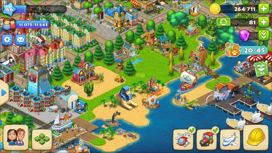 Постройте город своей мечты! Собирайте урожай на фермах, обрабатывайте его на своих предприятиях и продавайте товары для развития своего города. Торговля с экзотическими странами. Открывайте рестораны, кинотеатры и другие общественные здания, чтобы придать жизни вашему городу особый колорит.Исследуйте шахту, чтобы добыть ресурсы и найти древние артефакты. Управляйте собственным зоопарком и собирайте животных со всего мира.
