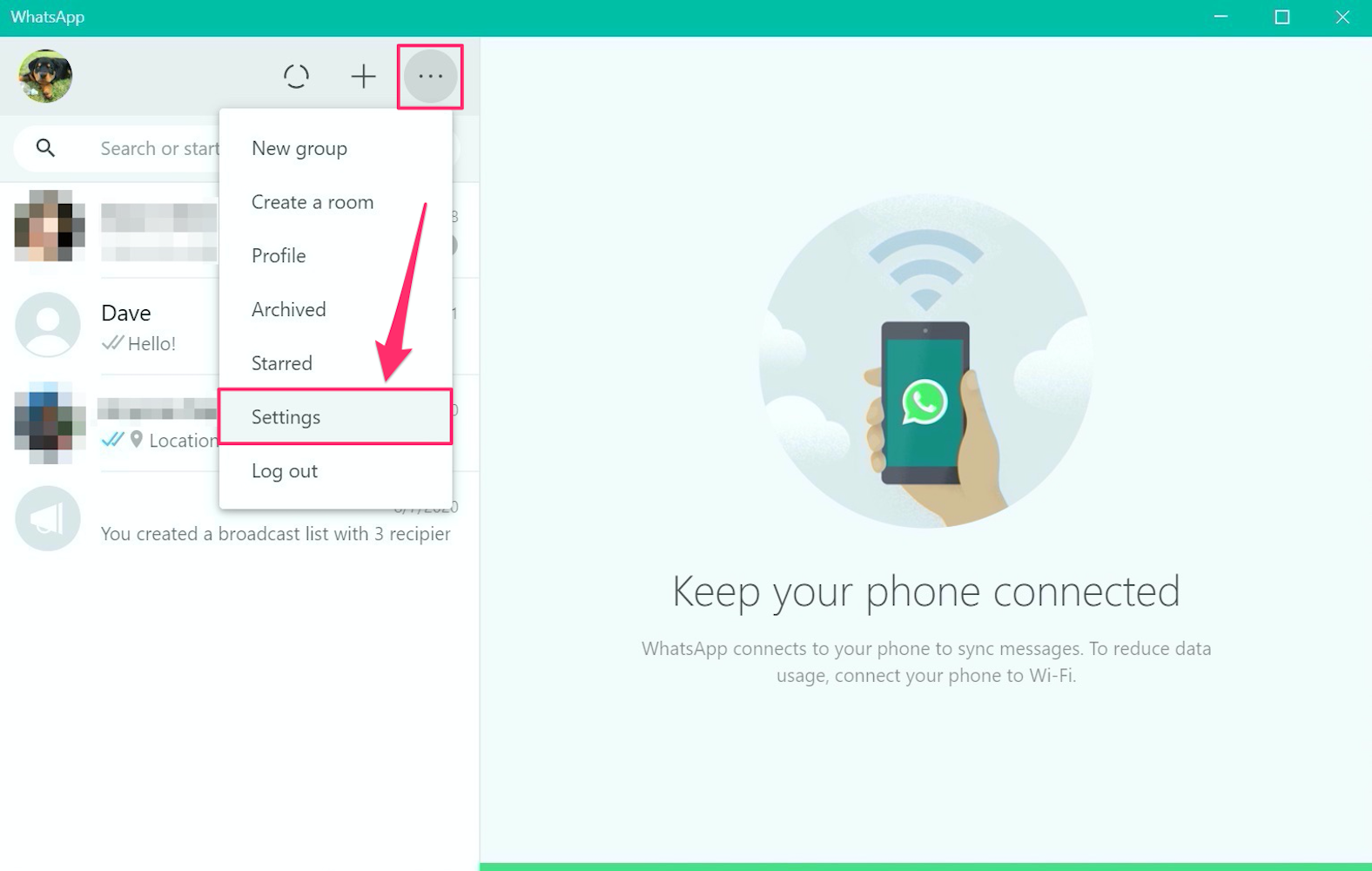 Перейдите в «Меню», затем «Настройки», затем «WhatsApp Web»