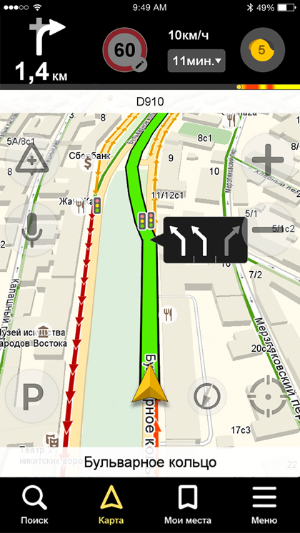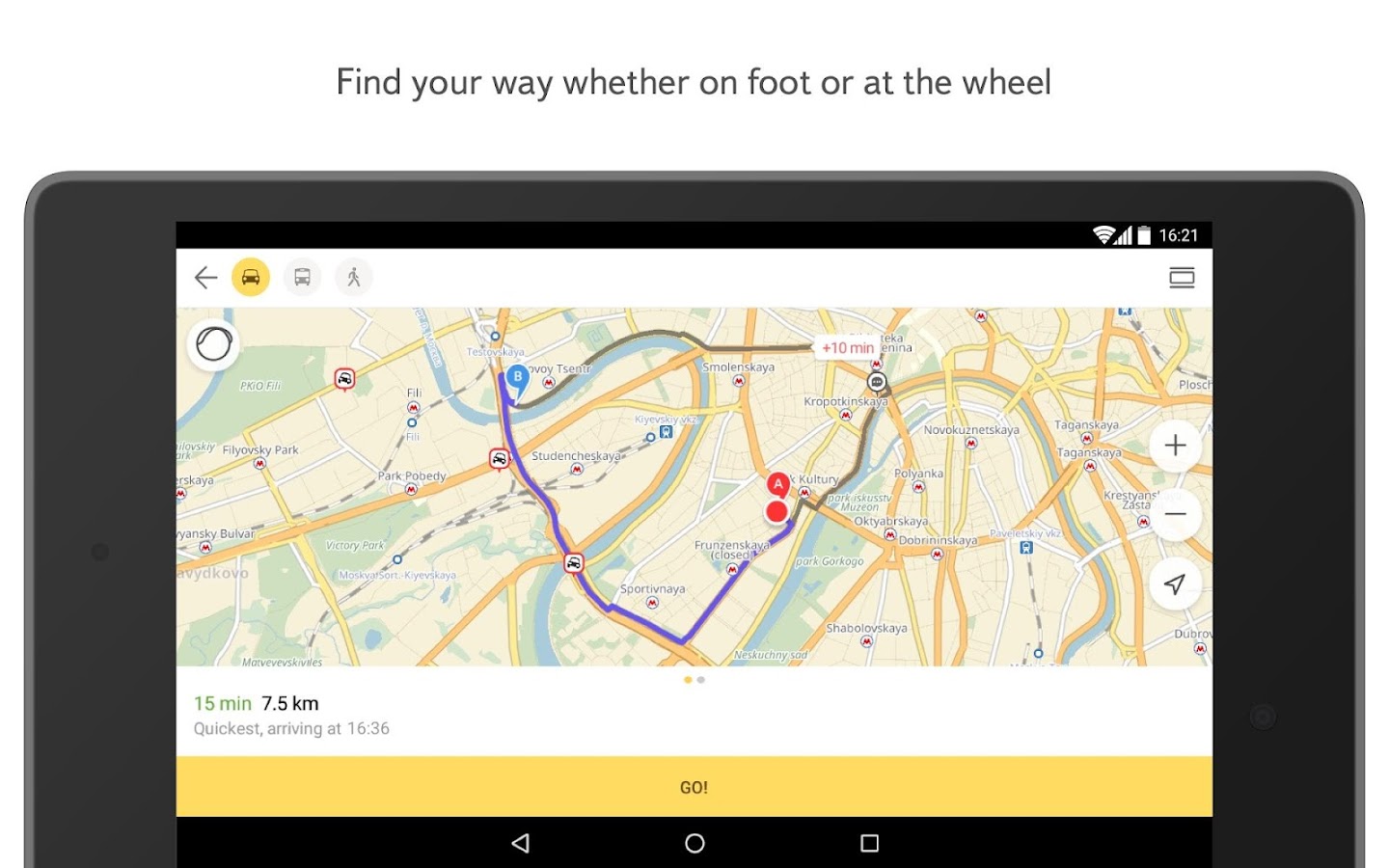 Скачать Яндекс.Карты на андроид работает в режиме оффлайн, то есть даже в тех местах, где не доступа к глобальной сети Интернет. Ранее сохраненные места на карте можно просматривать в любое время, нужно просто зайти в специальный пункт меню. Маршрут можно проложить как при движении на автомобиле, так и пешком. Пешеходная навигация осуществляется самим коротким путем, включая и проходы между домами, дорожки в скверах, пешеходные бульвары и т.д. Маршрут для проезда на автомобиле прокладывается с учетом анализа пробок на дорогах. В пути вам не нужно постоянно смотреть на экран. Выбранный вами голос в настройках, расскажет о маневренности движения, заранее подскажет о необходимости поворота.