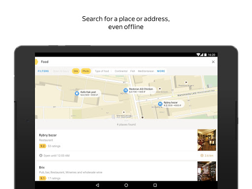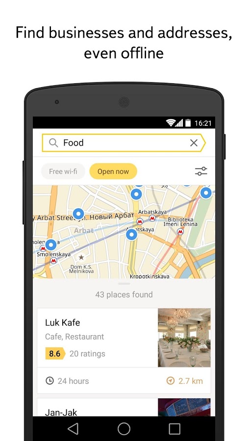 В начале 2016 года приложение получило самое масштабное за всю историю обновление, в ходе которого добавился полноценный оффлайн-режим. Очень большим достоинством является то, что даже в оффлайн режиме приложение покажет не просто необходимый пользователю адрес, но и всю имеющуюся информацию об этом месте. Это может быть график работы компаний, их контактная информация, расписание движения городского транспорта и даже приблизительная стоимость номера в гостинице!