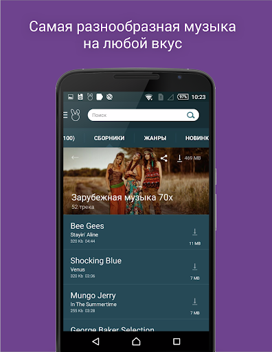В этом приложении собраны миллионы музыкальных композиций. Все они были и есть популярными, поэтому ежедневно их прослушивают миллионы пользователей. Если вам потребуется прослушать треки офлайн, вы всегда можете скачать их, используя эту программу. Прослушивай самые современные хиты русской и зарубежной эстрады, не подключаясь к интернету в любой момент. Можно также составить свой личный плейлист, в который войдут все твои излюбленные треки.