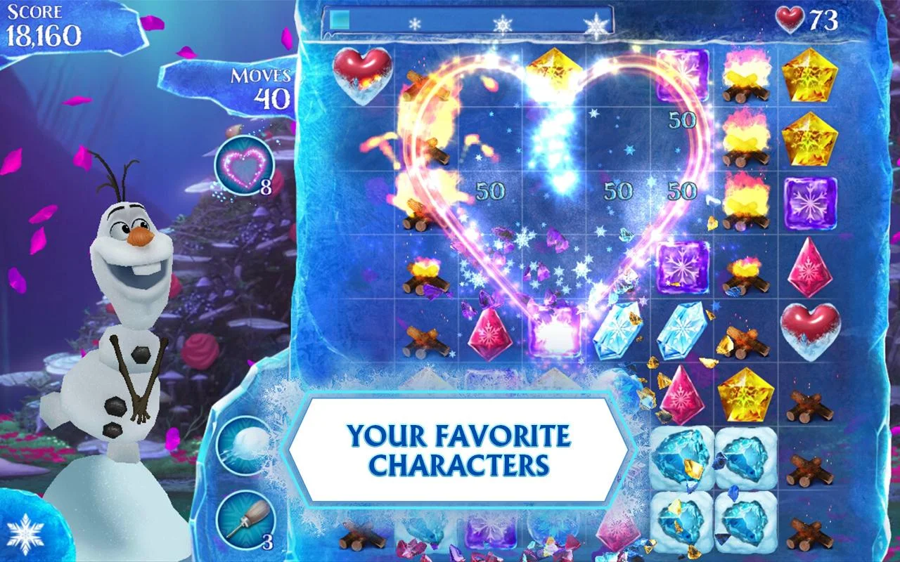 Удачно составленные комбинации приносят очки и возможность открыть доступ к бонусам. Несмотря на отсутствие возрастных ограничений, не все уровни подходят для детей и взрослых с первого раза. Для облегчения задачи предусмотрены символы помощи. Например, факел Анны поджигает серию кристаллов, а магия Эльзы убирает с поля элементы одного цвета.
